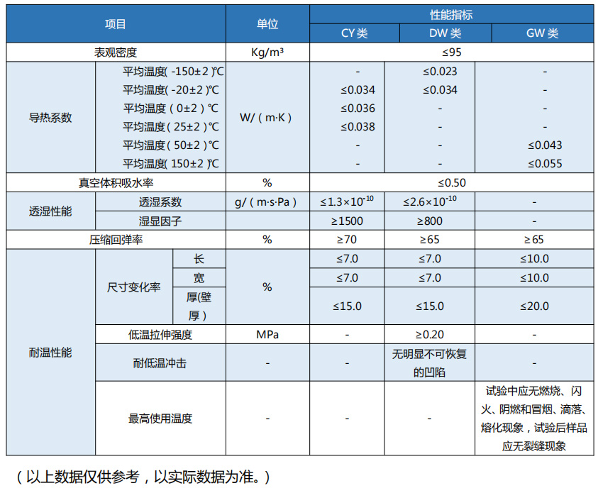 密度:40*80kg/m³;导热系数:0℃时≤0.03w/m.k ;使用温度:-40℃至 105℃