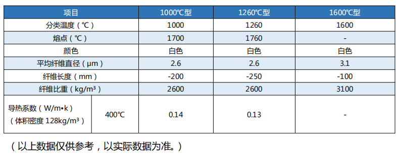 密度:96-160kg/m³;导热系数:0.06-0.3;使用温度:1000-1600°C。
